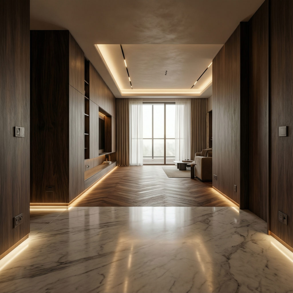 يشمل التصميم الداخلي، تركيب الأرضيات، الأعمال الكهربائية، السباكة، الدهانات، الأسقف المستعارة، وأعمال النجارة، حتى التسليم النهائي الجاهز للاستخدام.